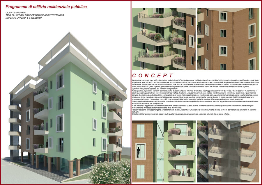 Il progetto è composto da 4 edifici dislocati su tre lotti diversi. E’ immediatamente visibile la diversificazione di tali lotti grazie al colore dei corpi di fabbrica che è diverso per le tre aree. Gli edifici, ad uso residenziale, sono caratterizzati dal piano terra la cui destinazione è commerciale.