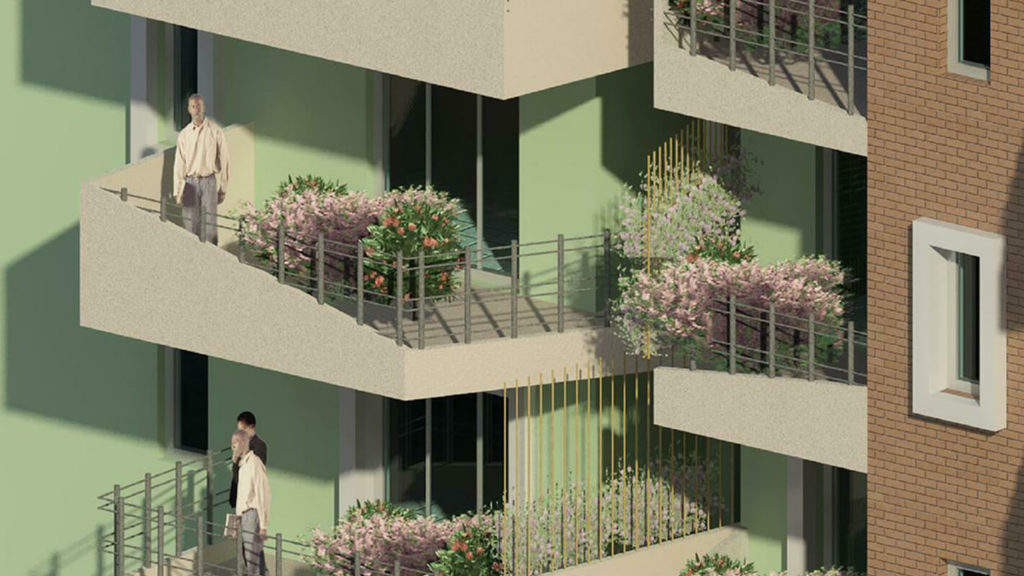 Il progetto è composto da 4 edifici dislocati su tre lotti diversi. E’ immediatamente visibile la diversificazione di tali lotti grazie al colore dei corpi di fabbrica che è diverso per le tre aree. Gli edifici, ad uso residenziale, sono caratterizzati dal piano terra la cui destinazione è commerciale.